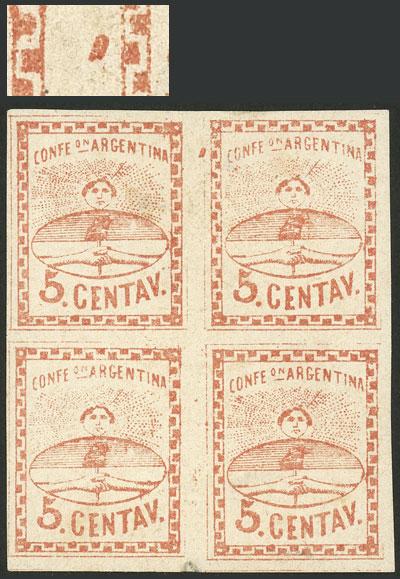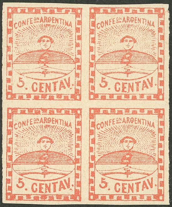 GJ.1e, 5c. small figures, block of 4, 2 with VARIETY: double period after "CENTAV.." (Image)