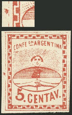 GJ.4, 5c. Large figures, with VARIETY: Color spot on the left vertical frame line (Image)