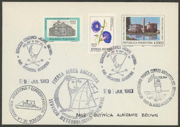 Cover sent from Brown Antarctic base to B.Aires on 9/JUL/1983, with the marks "Correspondencia Recibida de la Antártida" + of the National Meteorological Service (Image)