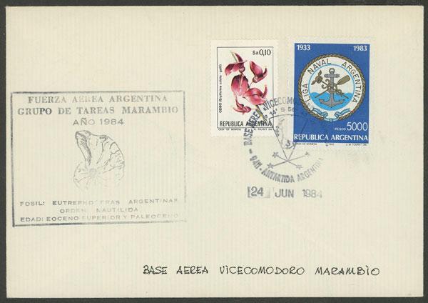 Cover sent from Marambio Antarctic base to B.Aires on 24/JUN/1984, on front there is an attractive handstamp illustrated with fossil (Image)