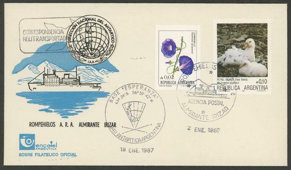 Cover sent from icebreaker Irizar to B.Aires on 2/JA/1987, with transit mark of Esperanza base, along the marks "Correspondencia Helitransportada" + "Correspondencia Recibida de la Antártida" (Image)