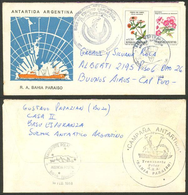 Cover sent from Esperanza Antarctic base to B.Aires on 18/FE/1988, with several marks on back of polar ship ARA Bahía Paraíso (Image)