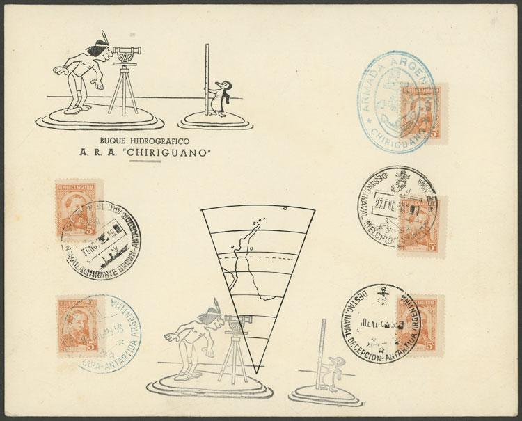 Souvenir of the hydrographic ship ARA "Chiriguano", with postmarks of 4 different Antarctic bases (Image)