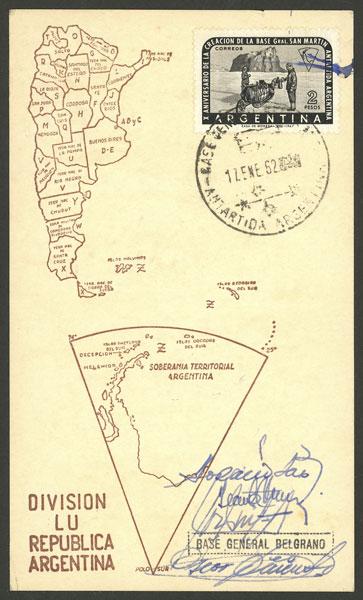 QSL card with postmark of Gral. Belgrano Antarctic base of 17/JA/1962 (Image)