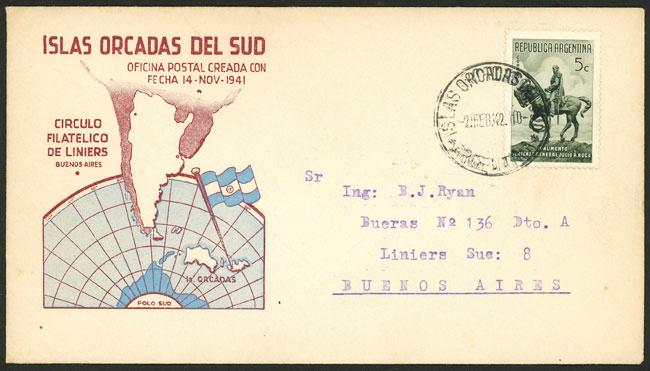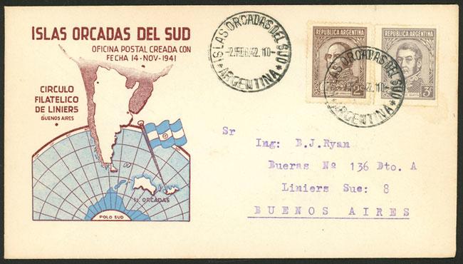 FIRST MAIL to the islands: Cover sent from Orcadas to Buenos Aires on 2/FE/1942, franked with 5c., arrival backstamp, VF (Image)