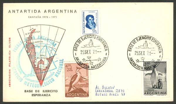 Card sent from Esperanza station to Buenos Aires on 25/SE/1971, with arrival backstamp of 17/AP/1972, very nice (Image)