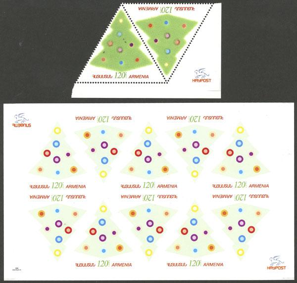 Sc.818, 2009 New Year (decorated Christmas tree), complete sheet of 10 stamps IMPERFORATE and WITHOUT FLOCKING, MNH, VF and rare. We include a normal pair for comparison. (Image)