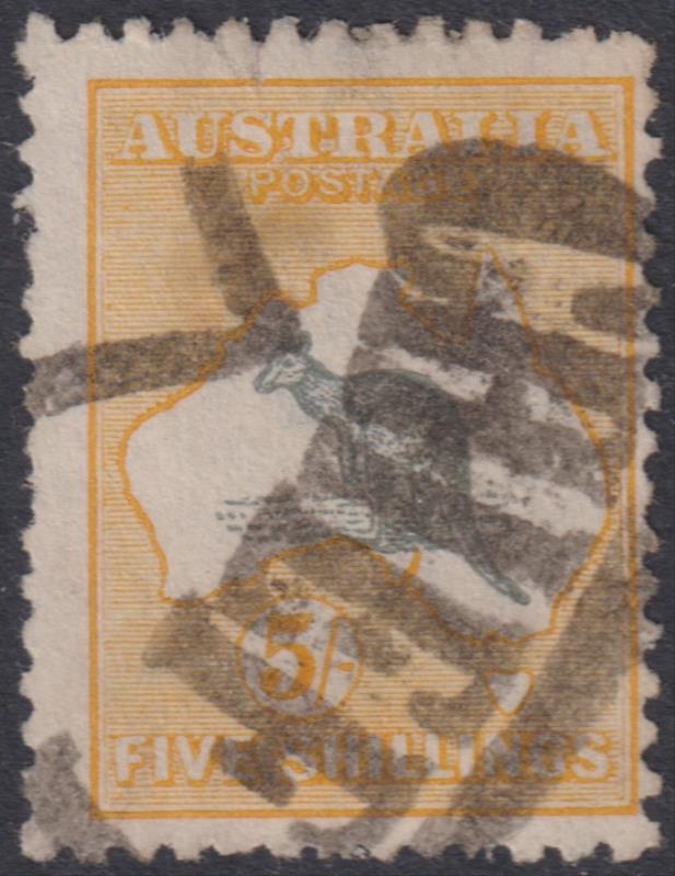 1918 5/- Roo, narrow crown wmk, parcel pmk. SG 42. Cat £120. GU. (Image)