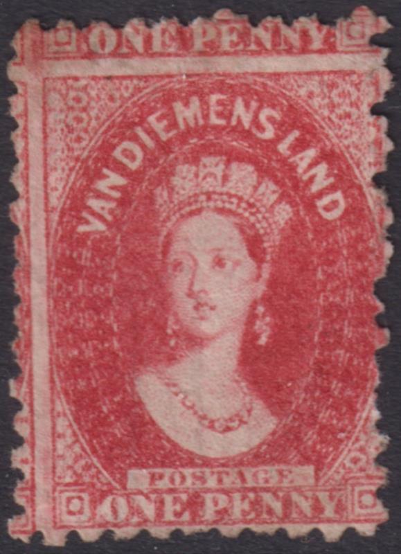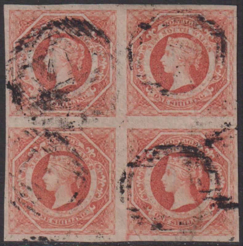 NSW 1854 1/- rosy-vermilion block of 4, imperf all 4 margins, 3 repaired tears on 2 stamps, not obvious from front. Smudged cancels all virtually clear of faces. SG 99. Cat £400. (Image)
