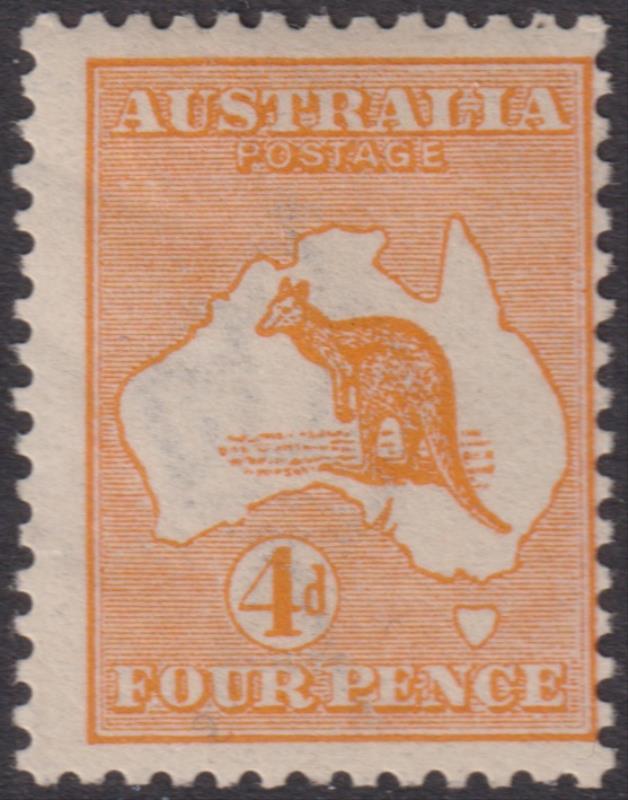 1913 4d Roo orange, Die II, broad crown over A wmk. SG 6. Cat £120. Mint. (Image)