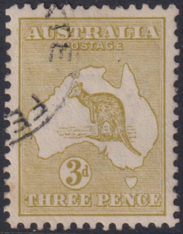 1915 3d Roo yellow olive, die II. SG cat £75. FU. (Image)