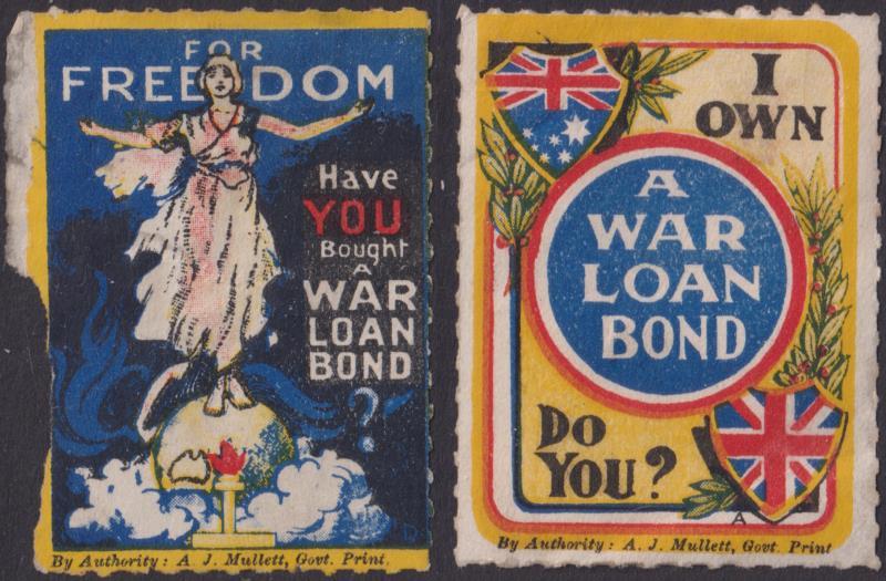 c1915 2 diff Warloan Bond cinderellas both with imprint of A.J Mullet, court print, at base. Both with adhesions & 1 with LH perfs damaged. (Image)