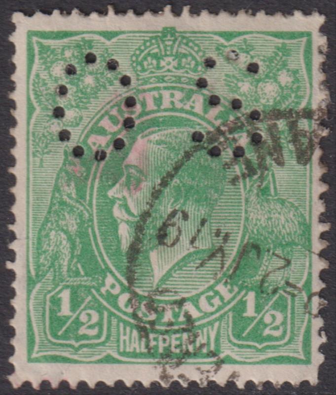 1924 ½d GV sage-green, multiple crown over A wmk, small "OS" puncture. SG O85. Cat £35. FU. (Image)
