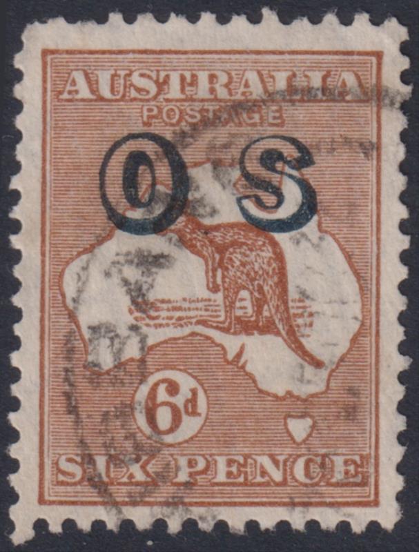 1932 6d Roo chestnut, ovptd "OS", mult crown over A wmk. SG O127. Cat £55. FU. (Image)