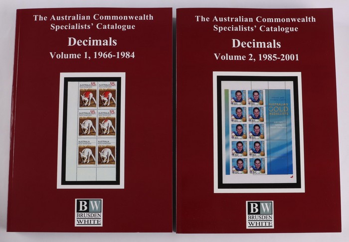 Australian Commonwealth Specialists' Catalogue - Decimals 1966-2001. ACSC New 2021 two volume set in A4 format with coverage of all things decimal, inc essays, proofs, varieties, marginal markings, missing colours, perforation errors inc imperf types, reprints, Framas, booklets, FDC & on commercial cover valuations. Essential reference, over 1100pgs. (Image1)