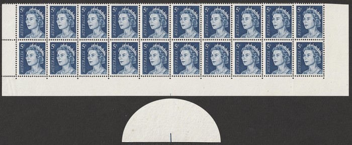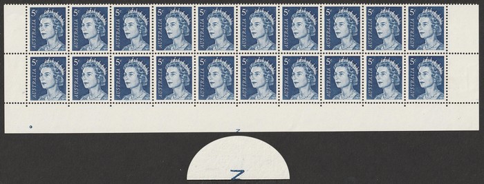 1966 QEII 5c Blue large part plate No 3, lwr marginal blk of 20. Hinge remains in selvedge o/w. VF MNH. ACSC 444, zd(var) cat $1000, unlisted w/o dashes & possibly unique. (Image1)