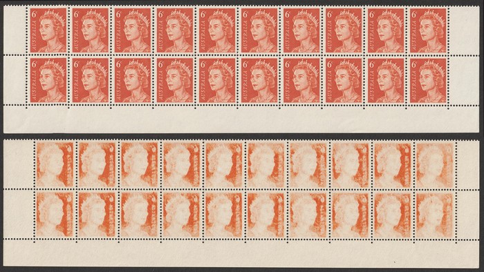 1966 QEII 6c orange with rev OFF-SET lwr marginal blk of 20, plated as Sheet A with ACSC listed variety 'missing left frame opp UST of AUSTRALIA' (Pos R9/1). Fresh MNH. ACSC 446o cat $2500. (Image1)