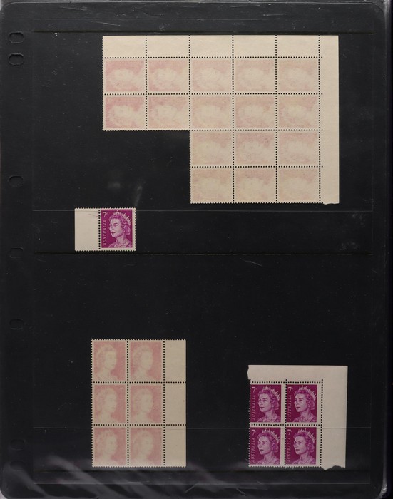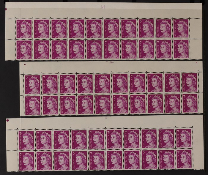 1966 QEII 7c purple. Massive 3 Vol specialist collection of comp sheets, Plate Nos & varieties inc positional blks & part sheets, mostly assembled at time of issue with unplated blks inc deep aniline inks, paper variations, partial off-set blk of 15, LL cnr blk of 10 with partial ink-stripping flaws & UL cnr blk of 14 (2x7) with pre-printing paper fold. Then plated blks with Sheet A upper marginal blks of 20 with tiny Plate 13 Nos (4, ACSC cat $3000), plus UL cnr (21) & LR cnr (12) blks of 4 or 6. Sheet B Plate 14 upper marginal blks of 20 (12, $360). Sheet C UL cnr blks of 12 (5) & UR cnr blks of 4 (17). Vol 2 entirely Sheet D inc lower marginal blks of 20 & larger (9) plus cnr & other positional multiples. Vol 3 with Sheet E inc comp sheet, upper ½ sheet of 50, plate 14 lower marginal blks (3) & other positional multiples. Sheet F inc plate 14 blks of 20, LL cnr blks (18) of 9 or 16. Majestic undertaking, assembled by specialist student at time of issue & only recently reorganised by current vendor. Original FV $270, Plate No alone cat $3500. Plus mega-mammoth total ACSC for the rest. Not for the faint-hearted. (3800+) (Image1)