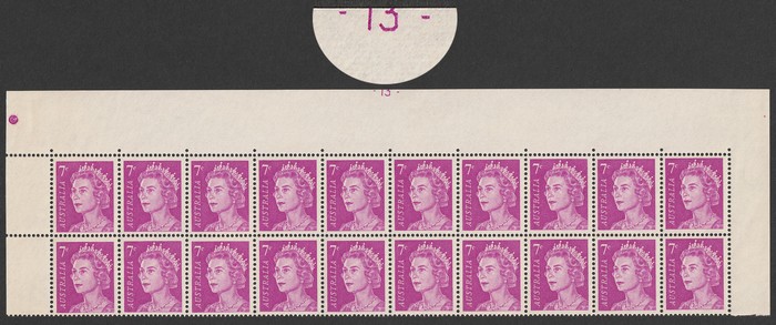 1966 QEII 7c purple plate -13- large part upper marginal blk of 20 (10x2) with type V perf-pip at UR cnr. Extremely rare with very few examples recorded. Hinge trace UL cnr o/w VF MNH. ACSC 447(2)za cat $1000. (Image1)