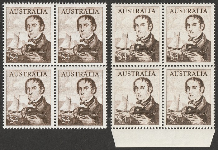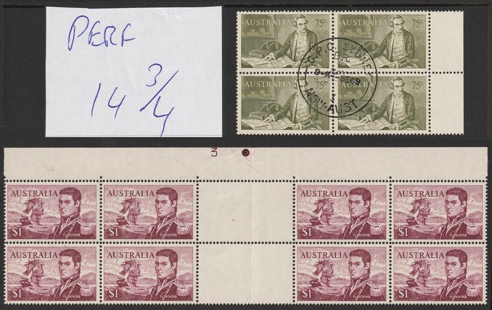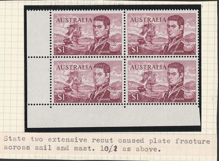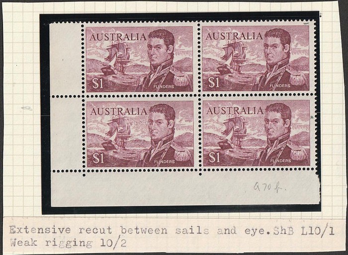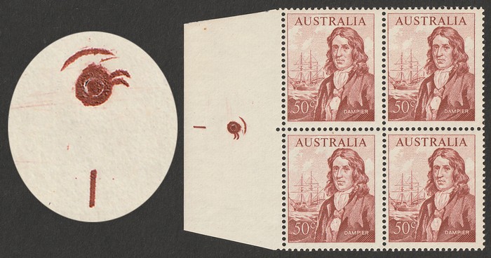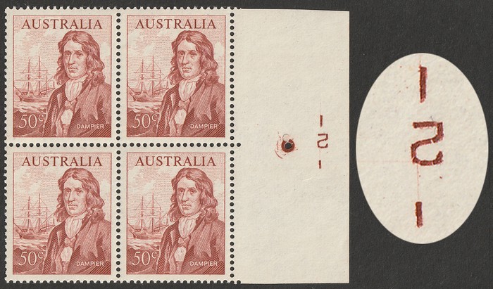 1966 Navigator 50c Dampier plate number 1 (inverted) left marginal blk of 4. LR stamp MLH, other 3 MNH. SG 399(var). ACSC 461 z cat $275. (Image1)