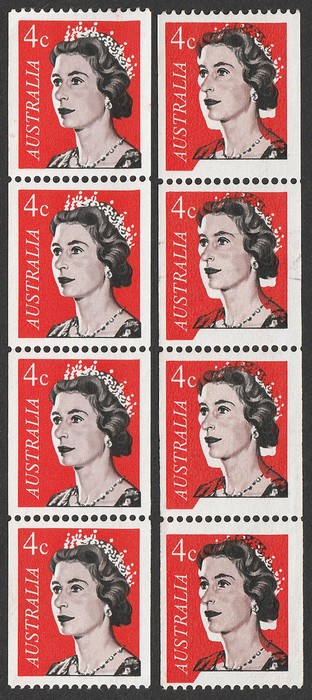 1966 QEII 4c Coil strip of 4 variety 'fawn & black colours misplaced 2mm upwards'. Strip of 4, 1 stamp M, other 3 fresh MNH. ACSC 468cc cat $375 ea, total $1500. Also another 2 strips showing misplaced Queen to lesser degrees & normal issue for comparison.(16) (P) (Image1)