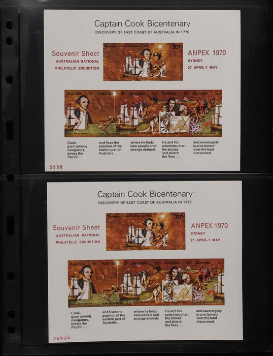 1970 Cook M/Sheets (8 diff) with original genuine ANPEX opt, fake ANPEX opt (num 46939) obliterated fake opt, unofficial perforations, 1970 Tullamarine opt, 1973 Eucharistic Congress opt & 1977 Royal Visit opt. (8). (Image1)