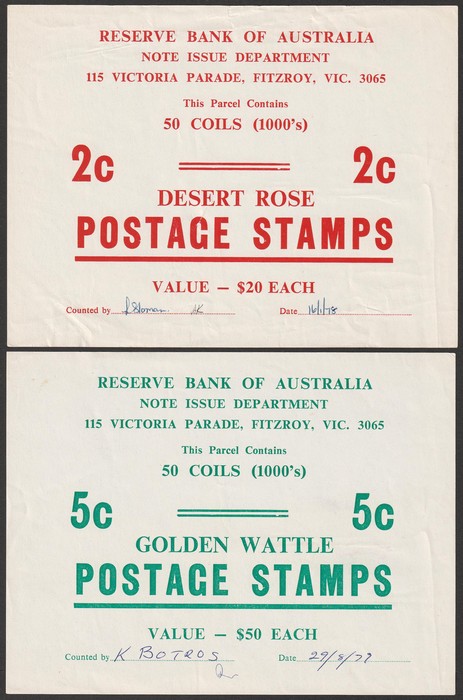1970 Coils 2c, 7c RBA 'Note Issue Dept' despatch labels for 50 Coils of 1000 stamps for 2c Desert Rose (in red) & 5c Golden Wattle (green) dated 1978 & 1979, respectively. Both VF. Rare. (2) (Image1)