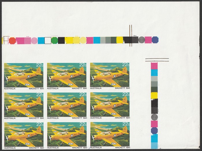1980 Aircraft 22c IMPERF cnr blk of 9 with extra wide margin at right & top with colour bars. VF fresh MNH. Originates from the 2nd of only 2 imperf sheets recorded. SG 761(var). ACSC 883PP(3)(var) cat $900+, plus premium for colour bars not on issued sheets. (9) (P) (Image1)