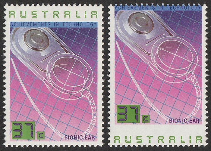 1987 Bionic Ear 37c error '5mm downwards perf shift resulting Australia at base instead of at top'. VF fresh MNH plus normal for comparison. SG 1082(var). ACSC 1224b cat $275. (P) (Image1)