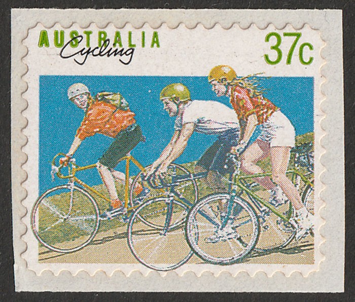 1989-1990 Cycling 37c UNISSUED self-adhesive stamp printed as an essay for Australia's 1st "peel & stick" but using wrong denomination & never issued due to rate increase. The original artwork for the Cycling stamp was for a 37c denomination but this was changed to 41c for the issue of the normal perf stamps, & it appears that when the 1st self-adhesive stamps were made the printer by mistake referred to the 37c artwork instead of the 41c perf stamps & so the self-adhesives were done as 37c in error! Superb MNH on original backing paper. SG 1180(var), ACSC 1379E(1) cat $6000 in 2002 editon (the change in price in later edition was made without basis & the footnote comments are totally incorrect). While the only known roll was temporarily in private hands the owner was forced to give it back Australia Post (apart from very few examples that had been cut from it) and thus almost all the examples are locked up in Australia Post archives, with only estimated 6-9 in private hands. Significant rarity of decimal period - previous examples we had have sold for between $3500 to $5000. Certificate can be obtained on request. (P) (Image1)