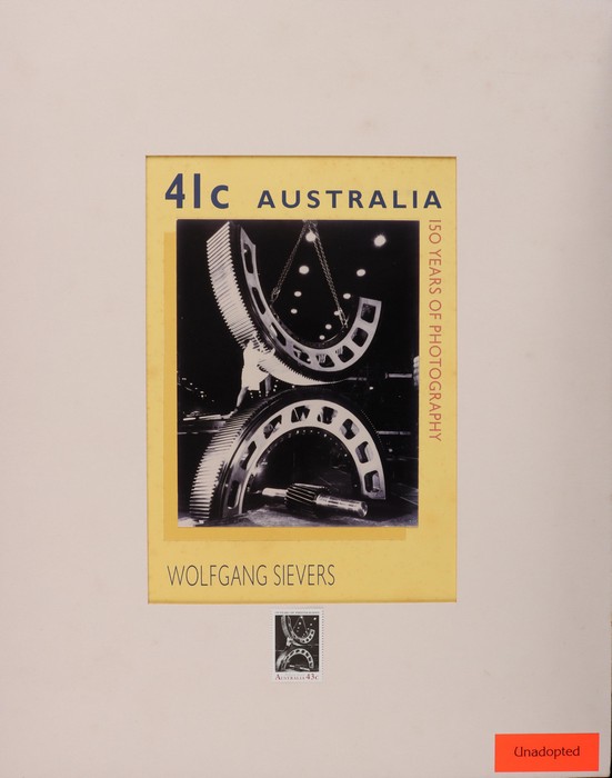 1991 Photography Anniv 41c 'Gears for Mining Industry' design. Unissued value & marked 'unadopted', though similar to issued 43c stamp with same photo. Sunken mounted 155x220mm. Whole presentation folder 265x380mm. With copy of list of reasons for rejection. F-VF. SG 1292(e). ACSC 1519(e). Unique. (Image1)