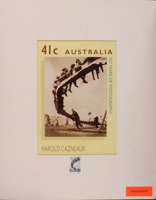 1991 Photography Anniv 41c The Wheel of Youth by Harold Cazneaux. Unissued value & marked 'unadopted' though similar to 43c issued stamp with same photo. Sunken mounted 155x225mm. Whole presentation folder 145x400mm. With copy of list of reasons for rejection. F-VF. SG 1293(e). ACSC 1520(e). Unique. (Image1)