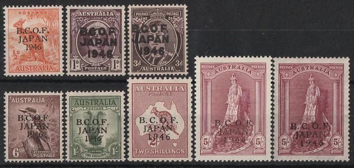 1946 BCOF Japan opt set of 8 inc both 5/- thick & thin papers. VF fresh MNH. SG J1-J7a cat £330. (8) (P) (Image1)
