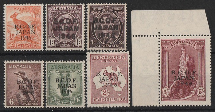 1946 BCOF Japan opt set, ½d to 5/- thin paper, 6d variety damaged 6 in date, 5/- missing serif on top of B. VF fresh MNH. SG J1-J7a cat £200+. (7) (P) (Image1)