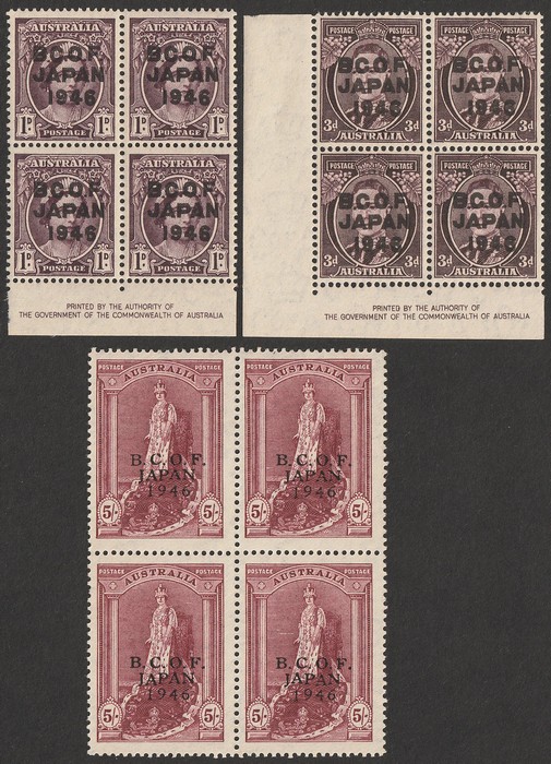 1946 BCOF Japan opt 1d & 3d imprint blks of 4, & 5/- thin paper blk of 4. VF fresh MNH. SG J2, J3, J7 £650. ACSC J2, 3 & 7 cat $1120. (12) (P) (Image1)