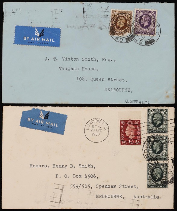 1935-39 UK-Australia Imperial Airways interrupted airmails carried on IE317 (landed Benghazi due to weather then damaged undercarriage at Rutbah ? Sanford 350227), IE363 (delayed 2 days Allahabad), IE498 (delayed Rangoon, damaged undercarriage), IIE646 (struck by lightning, returned to Rome), E655 (delayed at Marseilles, collided with a buoy at Athens) & SE180 (engine trouble Corfu, mail transferred, more engine trouble at Habbaniyah), all diff frankings for 1/3d rate, all but last with arrival b/s confirming flight. (6) (Image1)