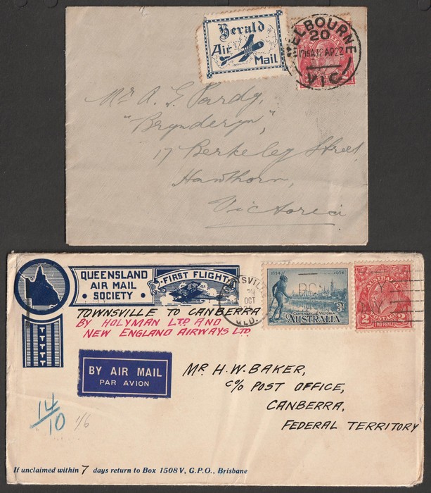 1922 Geelong-Melbourne Herald Experimental Flight cover franked KGV 2d red with blue vignette (rounded UL cnr) alongside, both tied by Melbourne arrival cds. AAMC 64 cat $1500. AAMC 64 cat $1500. Also 1929-70 First Flight cover collection (42, cat $1600) mostly Australia (and/or return) to New Guinea/Papua, South Africa, Chile, GB plus 2 1935 Holymans Airways flights. Some mixed condition & AAMC cat $3100. (43) (P) (Image1)