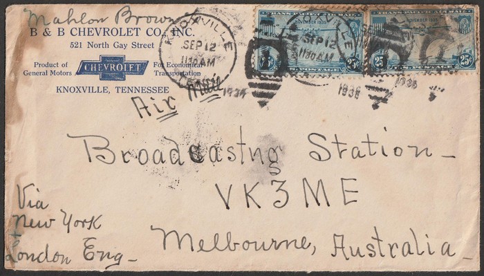 1936 (12 Sep) lightly charred cover from Chevrolet, Knoxville USA to Australia via UK, carried aboard Imperial Airways flight IE482 during which the 'Athena' was destroyed by fire 29 Sep at Delhi as oxygen instead of compressed air was used to start engines, Melbourne b/s 7 Oct, Sanford 360929, AAMC 632 cat 'from $250'. Ex Perry. (P) (Image1)