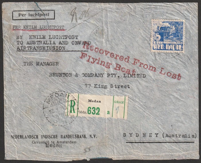1940 KNILM Bali crash cover, Registered, franked 5c tied 'Medan 13.1.40' cds (other stamps lost) plus cds tying black & green reg label, h/s in red 'Recovered from Lost/Flying Boat', to Sydney. AAMC 888 cat from $350+. Only 6 covers recorded with this h/s in red & very rare registered. (P) (Image1)