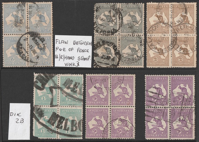 1914-38 blocks of 4 selection inc 1st wmk 6d '15 JUL 14' cds, 3rd wmk 2d grey, 2/- brown 'Kalgoorlie 16 JL 21' cds, 3rd wmk 1/- blue green Die IIB, CofA wmk violet 2 blks. Mostly GU-VFU, 1 x 2d, 9d & 1/- flts. ACSC cat $580+++ as singles. Used blks of 4 are difficult to find, particularly the rare 2/- brown. (24) (P) (Image1)