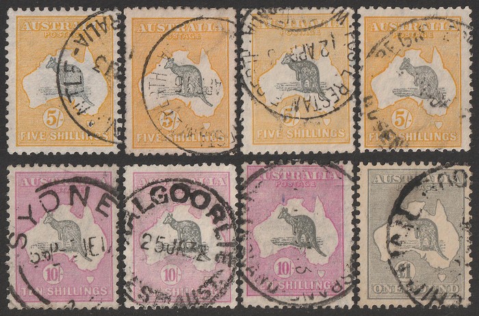 1913-29 2d to 10/- perf OS selection inc 4d orange, 3rd wmk 2/-, 5/- & 10/-, the 10/- has 'shading breaks in gulf', Small Mult wmk 9d & 5/- CTO, then a perf OS NSW range inc 1st wmk to 1/-, inc 2½d, 4d & 1/- which are scarce & 6d F MLH, very scarce. There are several perf Ts, perf VG & Private perf. Mostly G-VFU. ACSC cat approx $2550+ valuing OS/NSW as OS. (28) (Image1)