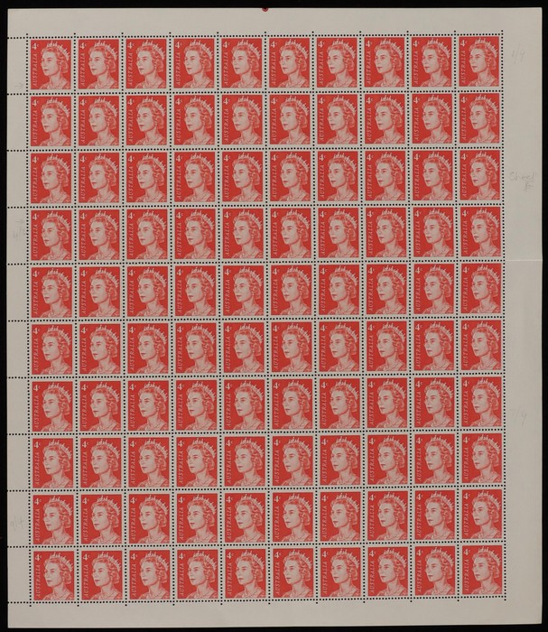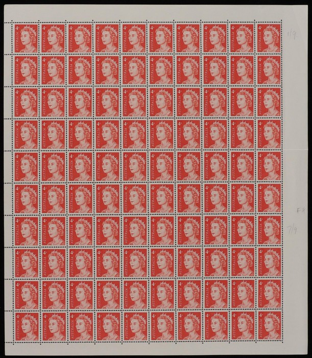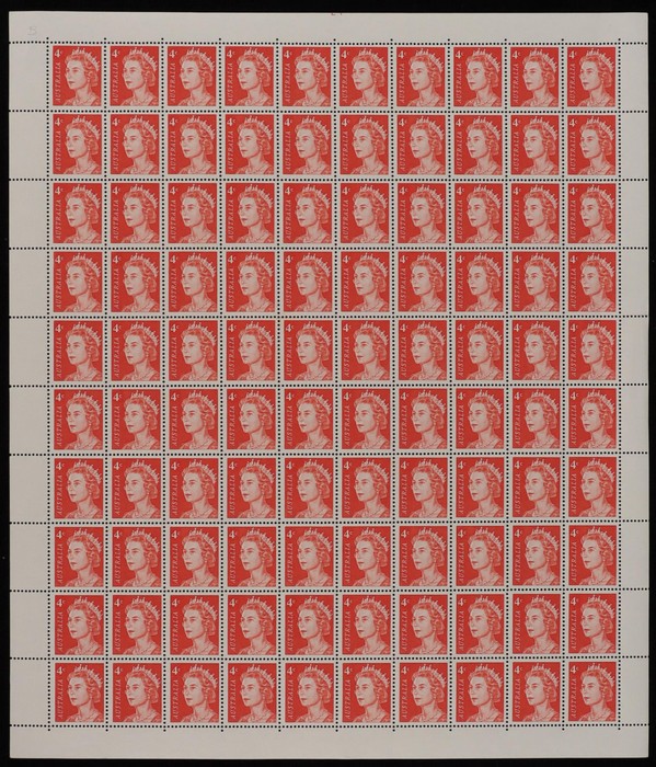 1966 QEII 4c red sheet of 100 with central perf-pip in upper selvedge, plated as Sheet A with ACSC listed variety 'missing frame LL cnr' (Pos 1/1). VF MNH. SG 385(var). ACSC 439 b d cat $68. (Image1)