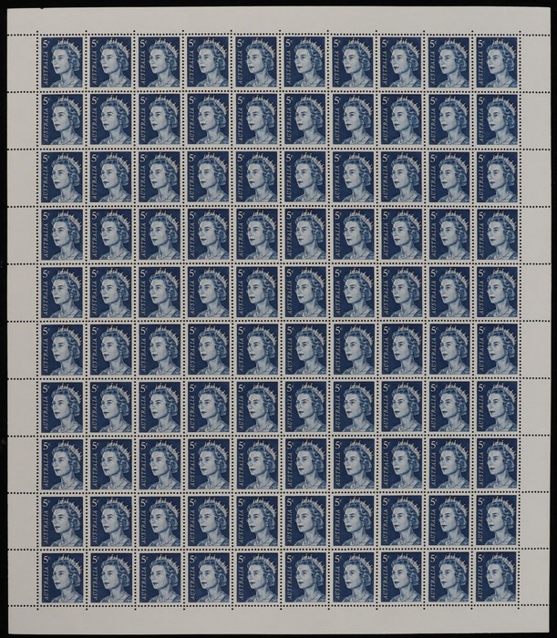 1967 QEII 5c blue sheet of 100 with perf-pip trace at UL cnr above stamp 1 with constant varieties 'weakness over 5c' (Pos 1/1), 'uneven LL cnr' (6/4) & 'thin frame at LR cnr' (6/8). Fresh MNH. SG 386(var). ACSC 444 (variety) cat $80+. (Image1)