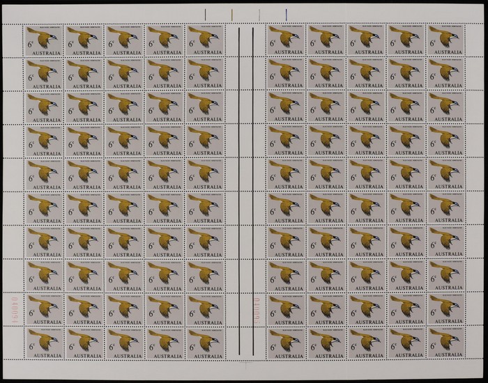 1966 Birds 6c Honeyeater sheet of 100 with Autotrons at top, both red sheet numbers & varieties 'retouch under 6c' (Pos LP2/4), 'white dot in U of Australia' (LP10/3) & 'retouch over TRAL of Australia'. Fresh MNH. SG 387(var). ACSC 449 d e f zc zf zh cat $150. (Image1)