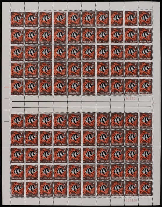 1966 Humbug Fish 7c sheet of 100 with Autotrons at left, both red sheet numbers & variety 'retouch in left frame at edge of coral' (Pos LP2/1). Fresh MNH. SG 388(var). ACSC 450 d zc zf zh cat $170. (Image1)