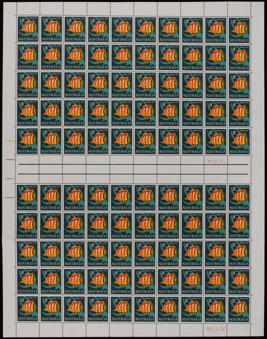 1966 Coral Fish 8c sheet of 100 with Autotrons, both red sheet numbers & variety 'retouch under IA of Australia' (Pos LP4/9). Fresh MNH. SG 389(var). ACSC 451 d zb ze zg cat $170. (Image1)
