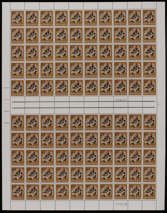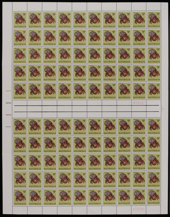 1966 Hermit Crab 9c sheet of 100 with Autotrons at left, both red sheet numbers & varieties 'diagonal green band in upper right cnr' (Pos UP1/9) & 'vert weakness from R of Australia to claw' (UP3/10). Fresh MNH. SG 390(var). ACSC 452 d e zb zd ze cat $200. (Image1)