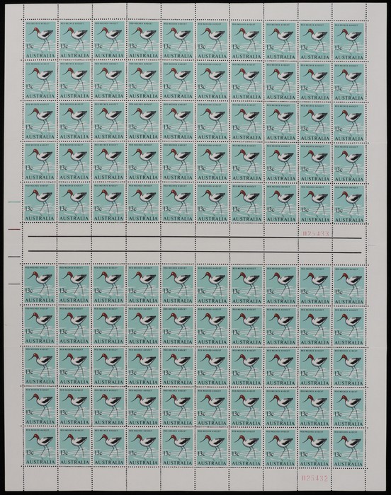 1966 Birds 13c Avocet sheet of 100 with Autotrons at left & both red sheet numbers. Fresh MNH. SG 392(var). ACSC 454 zb zd ze cat $250. (Image1)