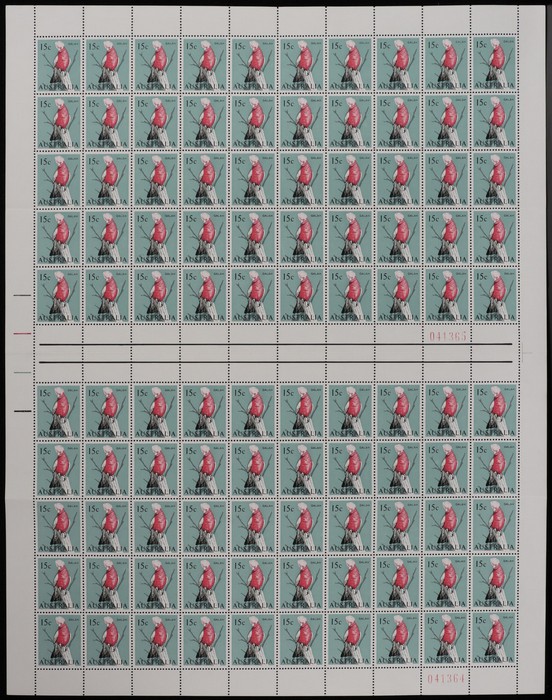 1966 Birds 15c Galah sheet of 100 with Autotrons at left, both red sheet numbers & 7 diff ACSC listed varieties inc 'retouch right of Galah' (Pos UP 2/7), 'retouch over AL of Galah' (UP 2/8), '2 grey dots over U of Australia' (UP 4/3) & 'retouch over LA of Galah'. Fresh MNH. SG 393(var). ACSC 455 d ea h ia j k l zb ze zf cat $560. (Image1)