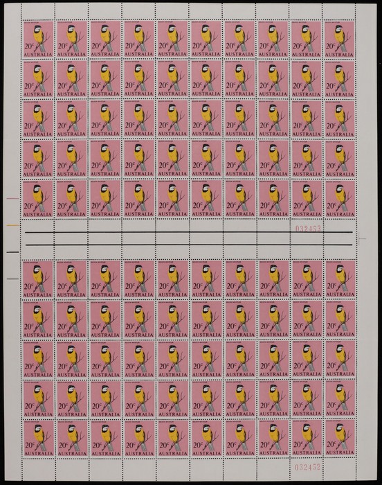 1966 Birds 20c Golden Whistler sheet of 100 with Autotrons at left & both sheet numbers. Fresh MNH. SG 394(var). ACSC 456 zb zd ze cat $550. Very scarce sheet. (Image1)